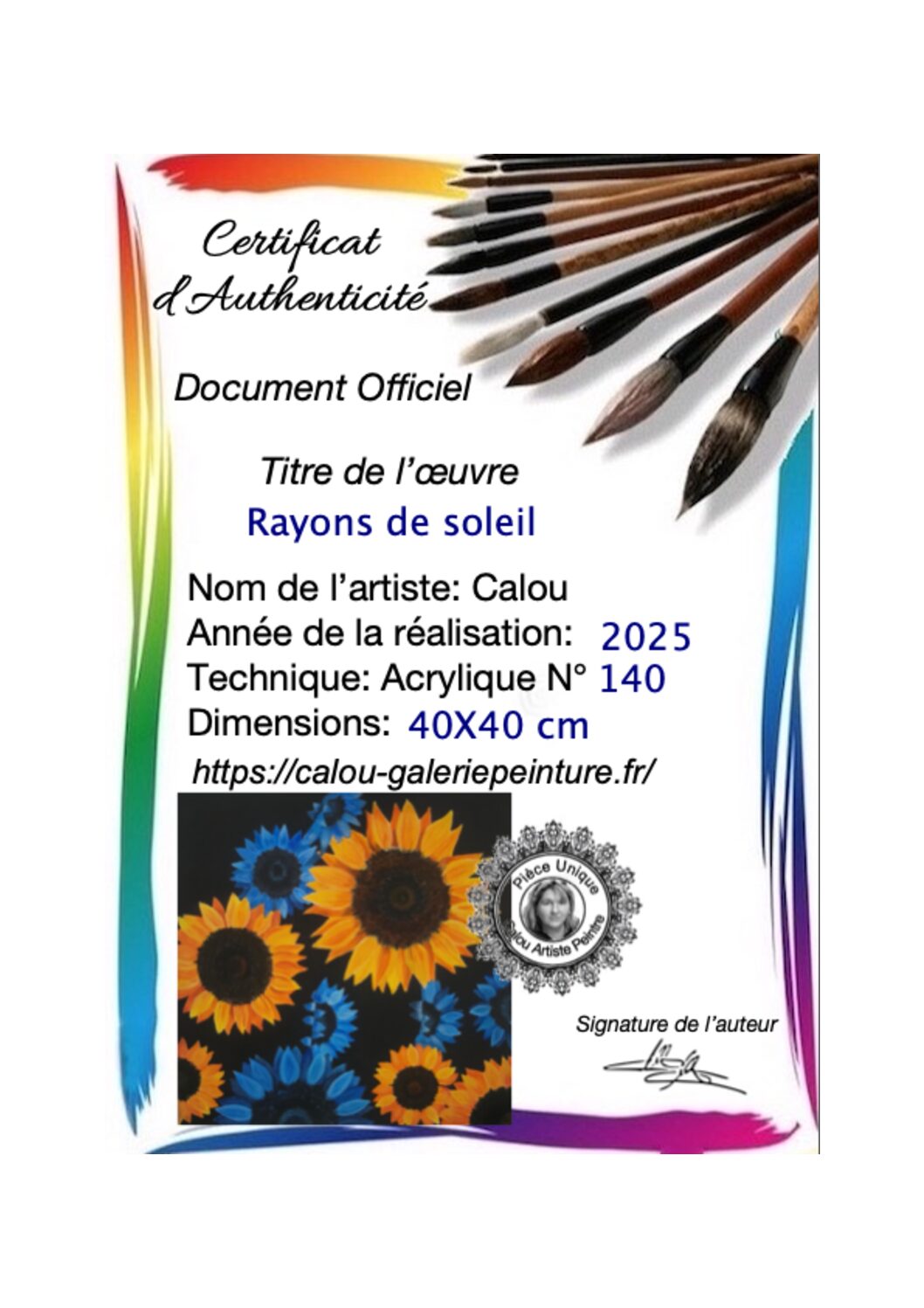 Cette peinture décorative sur toile présente un champ de fleurs de tournesols bleus et jaunes mêlés, leurs pétales éclatants formant un contraste saisissant entre fraîcheur onirique et chaleur solaire. Les fleurs, délicatement disposées, semblent danser sous une brise légère, créant une atmosphère à la fois très poétique et vibrante.